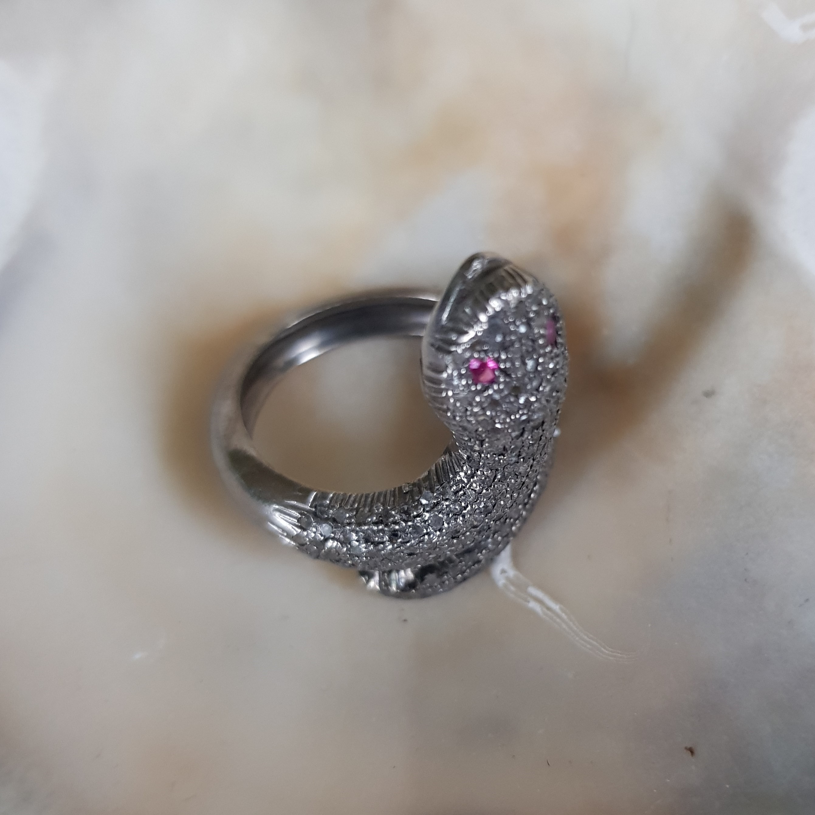 Jedna sztuka. Srebrny rodowany w kształcie węża z drobnymi diamencikami i rubinowymi oczami.