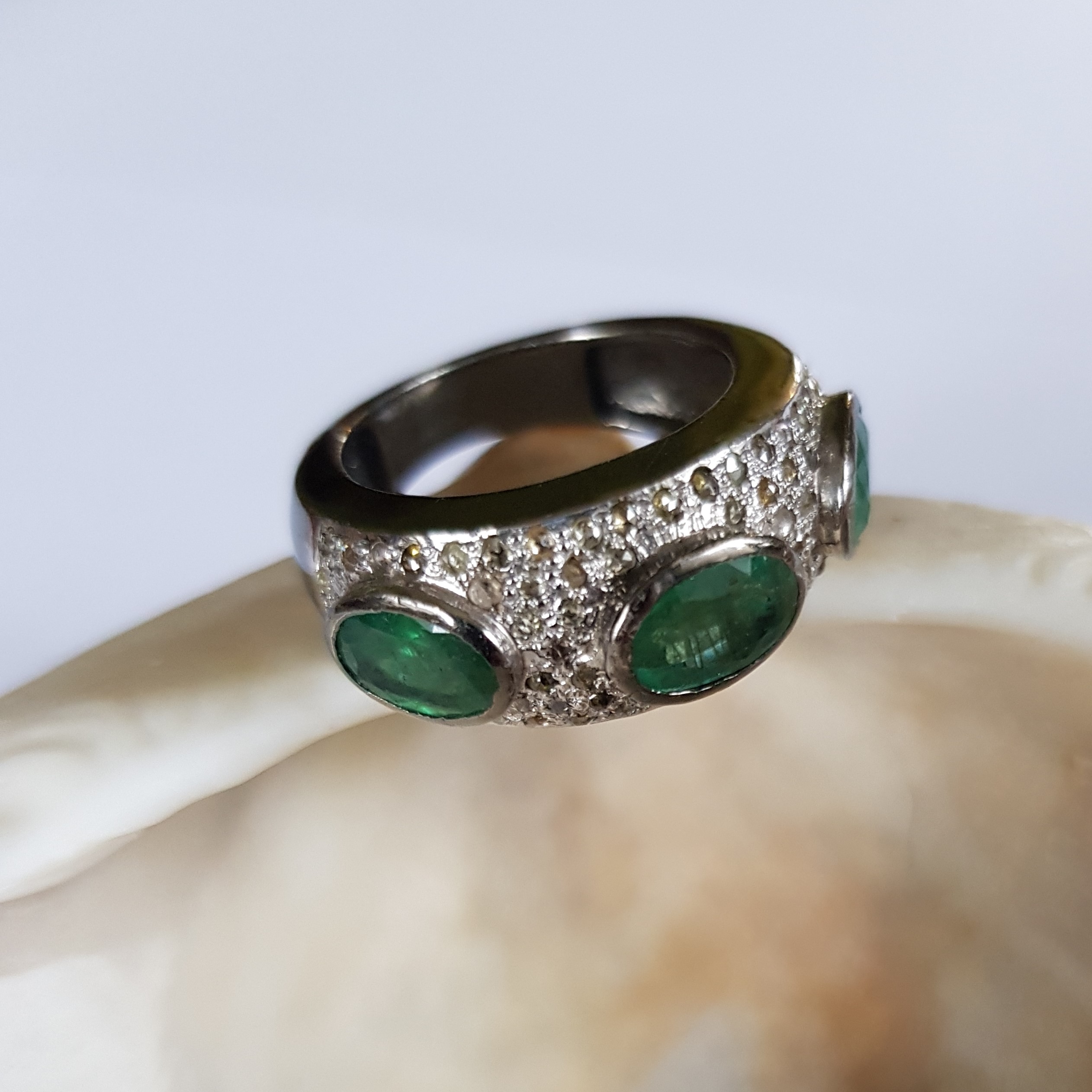 Jeden egzemplarz. Srebrny, rodowany pierścionek z trzema szmaragdowymi oczkami o wymiarach 5 na 8 mm otoczonymi diamencikami. Niezwykle efektowny.